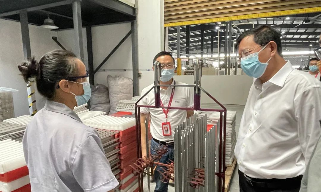 邬江主席与杨军副总经理详细了解了公司生产物资保障、疫情防控措施、闭环运行管理等,并深入喷涂产线、镀镍产线进行了现场慰问,与电镀员工一起共进午餐。餐间,亲切与员工交流,当了解到技佳电镀装饰公司在保障好员工食宿的同时,还安排了乒乓球比赛、国庆观影等业余活动时,给予了充分肯定。