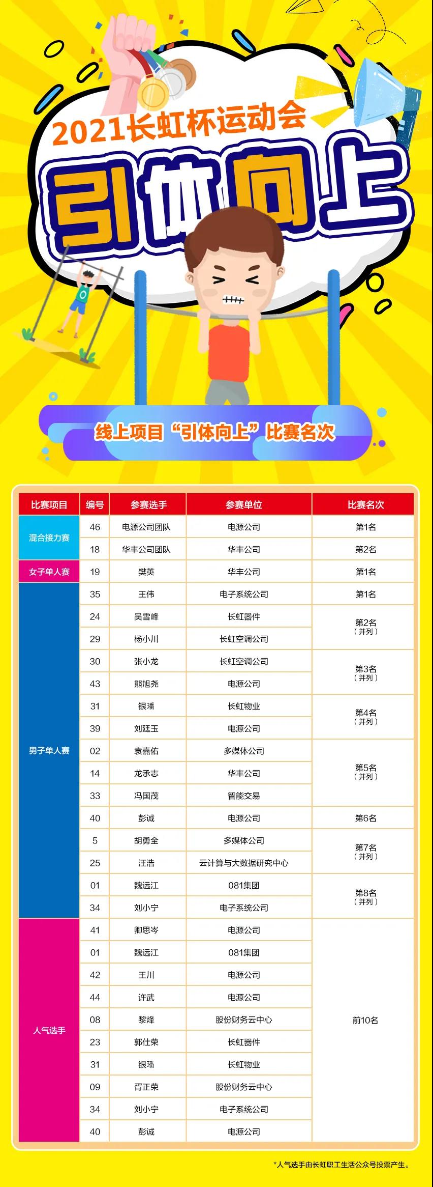 引体向上比赛项目裁判组对所有比赛视频进行多次观看,依据引体向上项目评判规则,经过直接计数、下巴未过杠违例、大小臂夹角违例、过程规范加分等方面的记录得出有效成绩,按有效成绩评出各项目的前八名(参加单位或人数不足八名的项目仅评选前三名),人气选手依据“长虹职工生活”微信号投票数量产生。