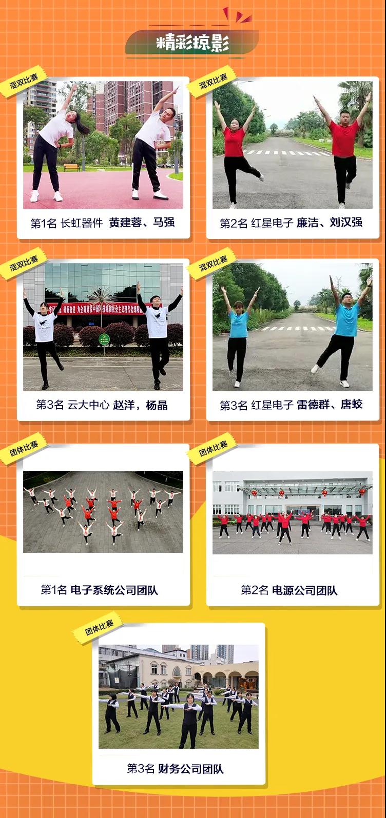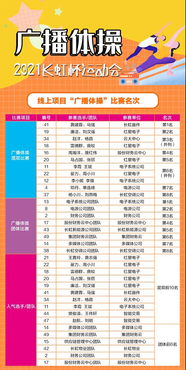 本次广播体操比赛分为男女混合双人赛和团体比赛,有290余名来自全国范围的长虹职工参加比赛。经过裁判组对比赛视频的观看,依据评分规则(人数、上下场、动作准确、团队协调、个人体态、节奏/精神、队形/服装等)评分,评出各项目的前八名。人气选手依据“长虹职工生活”微信号投票数量产生。