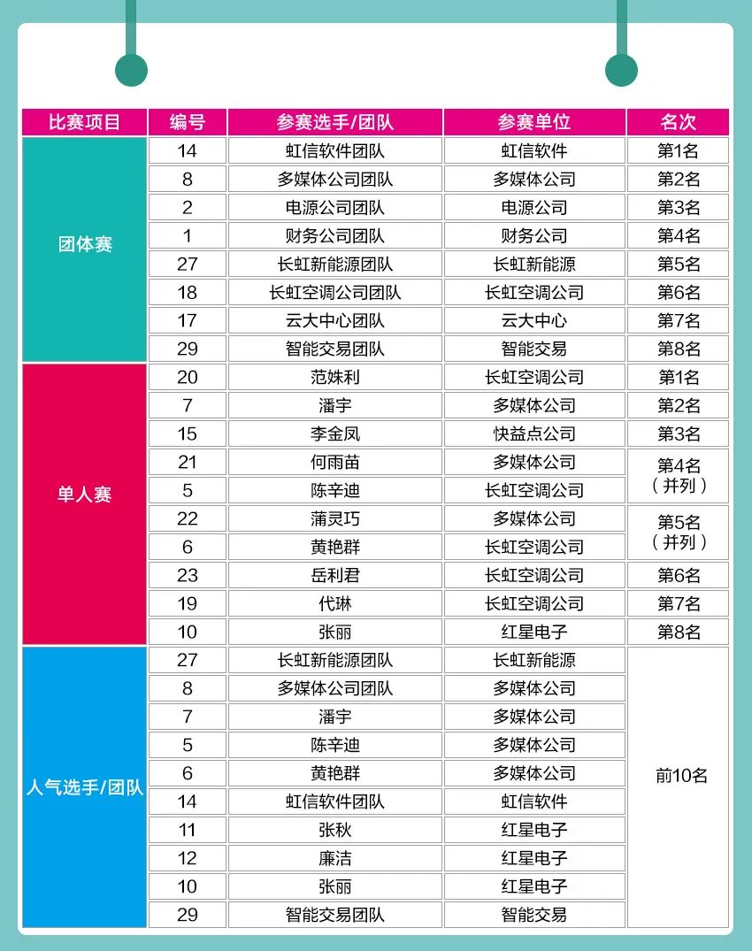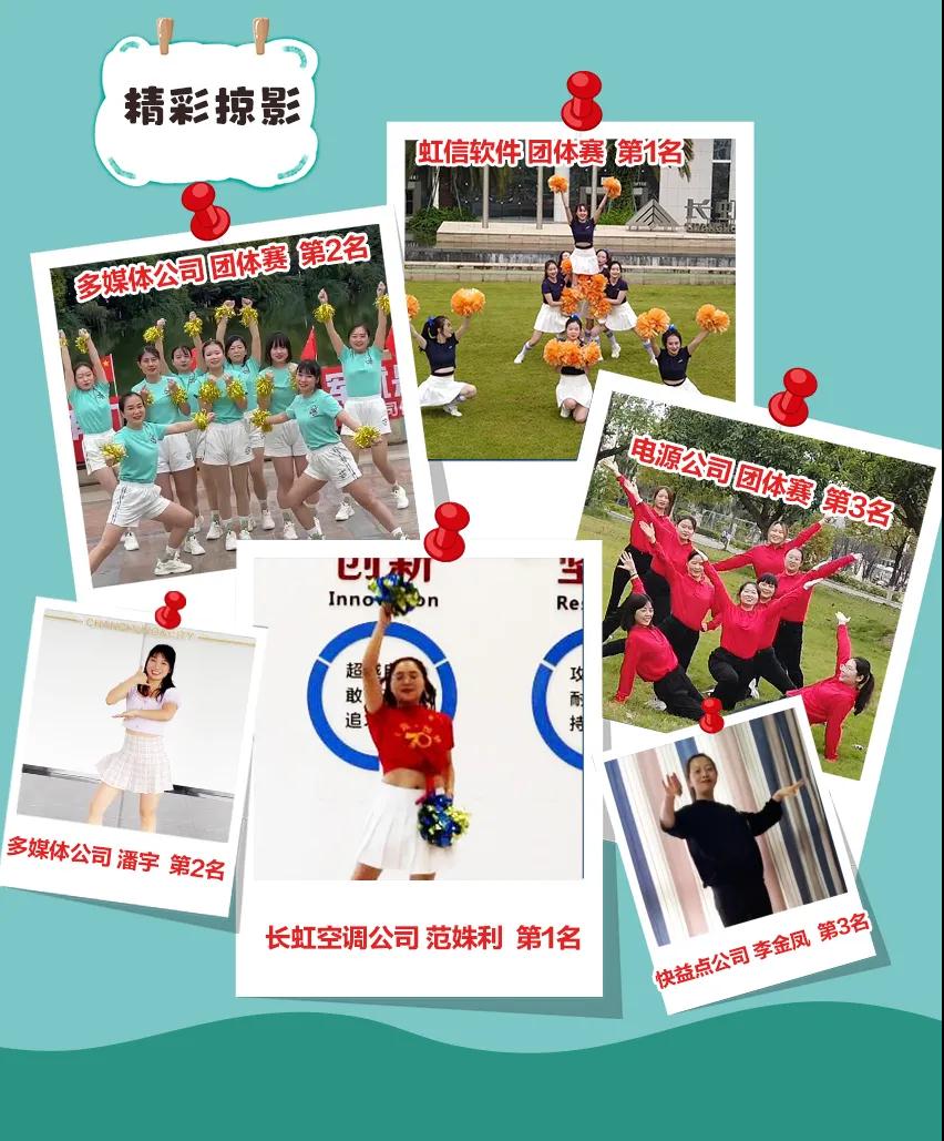 本次女子健美操比赛精彩纷呈,展示了长虹女职工的健康美、运动美。特别是女子团体健美操的比赛,精心编排、整齐统一、青春时尚、活力四射。经过裁判组对比赛视频的观看,依据评分规则(人数、难度、表现力、表情、服装、整齐度、后期等)评分,评出各项目的前八名。人气选手依据“长虹职工生活”微信号投票数量产生。