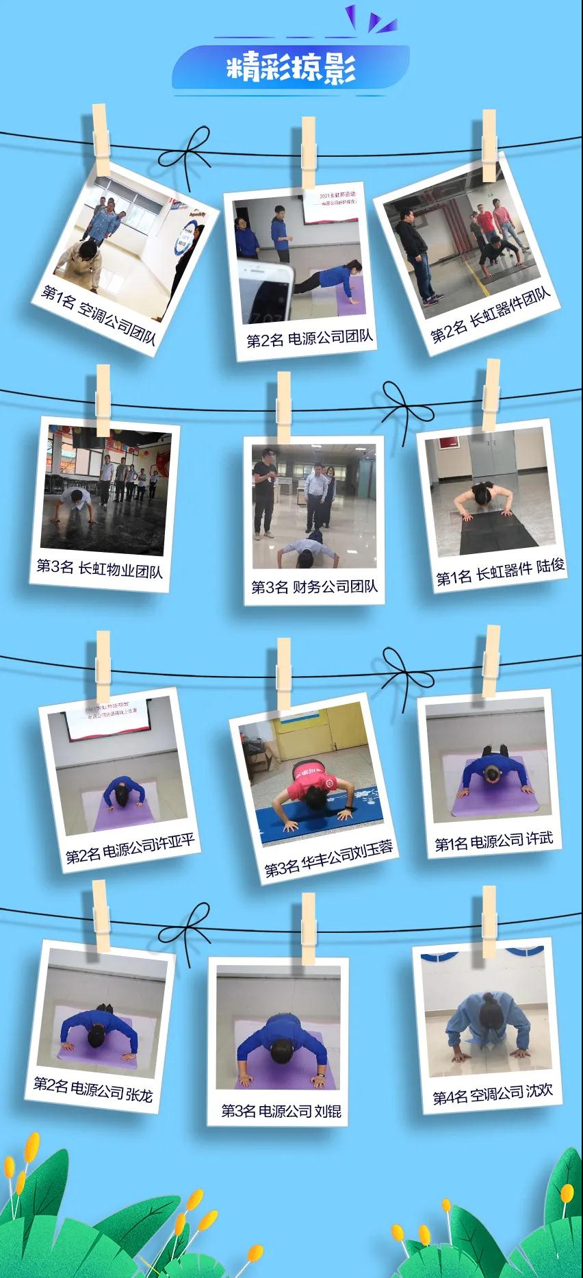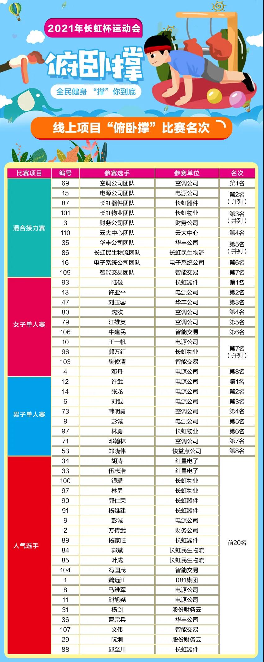 俯卧撑比赛项目裁判组对所有比赛视频进行多次观看,依据俯卧撑项目评判规则(接力赛:直接计数、否决项-人数/性别、扣分项-站位/接力/时间/动作、加分项-统一服装/准备动作/结束动作。单人赛:直接计数、扣分项-动作/时间/休息、加分项-准备动作/结束动作)得出有效成绩,按有效成绩评出各项目的前八名,人气选手依据“长虹职工生活”微信号投票数量产生。