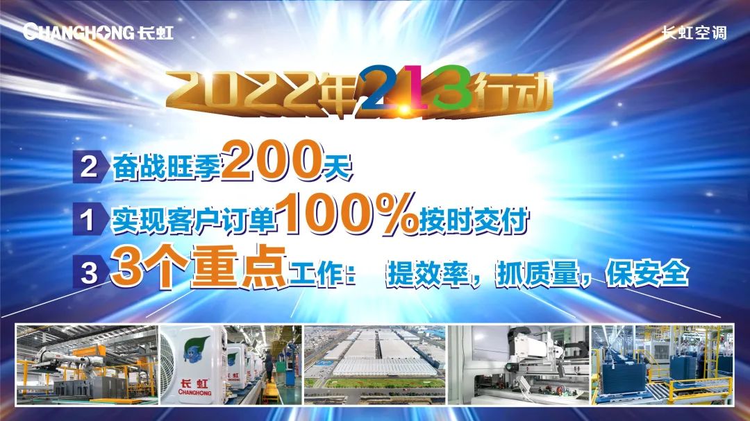 更快、更细、更苦、更累,在抗疫保产的一次次考验中,努力拼搏是长虹空调人始终保持的昂扬姿态,也是长虹空调人镌刻在内心深处的座右铭。在战胜困难的征程中,既要灵活机动,也要坚韧不拔,而这必须要靠战略定力作为有力支撑。面对疫情时期的内外部形势,长虹空调早在年初就制定了年度“213”行动计划,围绕1个目标(实现客户订单100%按时交付),奋战200天,推进3大重点工作(安全、质量、效率),促提效控费、质量提升、订单交付。在2022年的订单激增中,“213”行动计划发挥出了重大的保障作用。战斗一旦打响,在胜利的集结号吹响之前,就没有撤退可言。在接下来的四季度整体经营工作中,长虹空调仍将持续有力地推进“213”行动计划,夺取全年保订单交付、促经营发展的全面胜利。