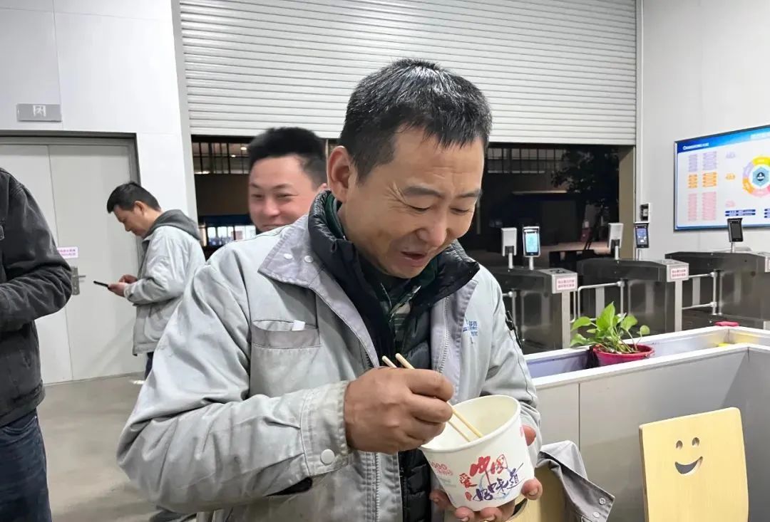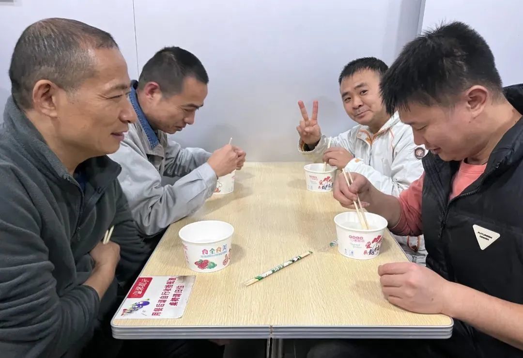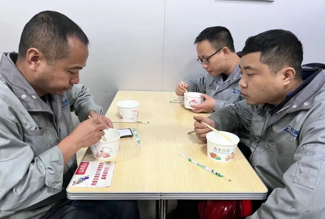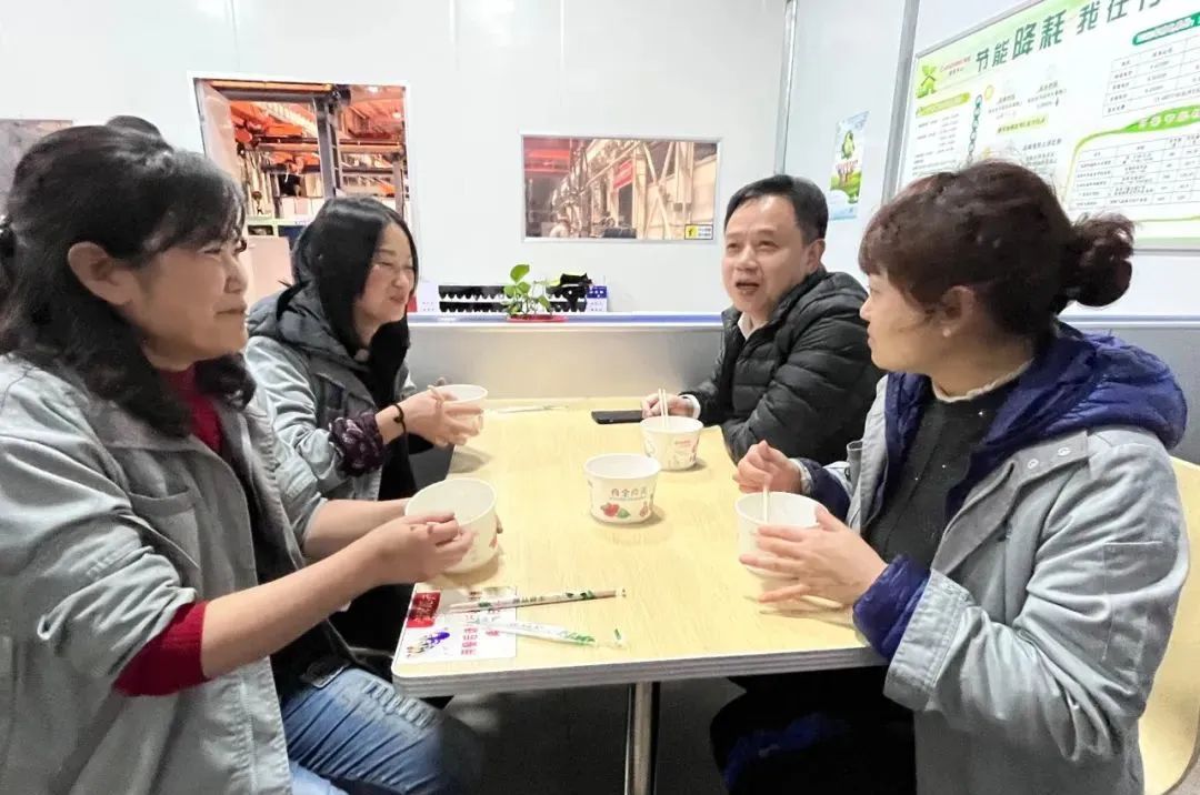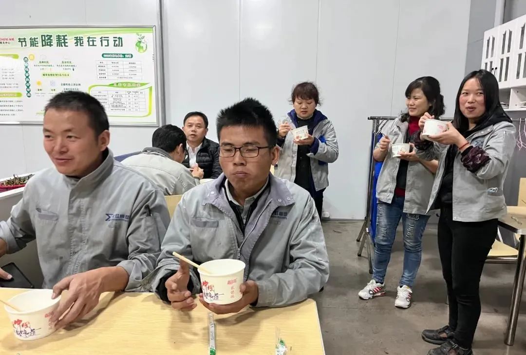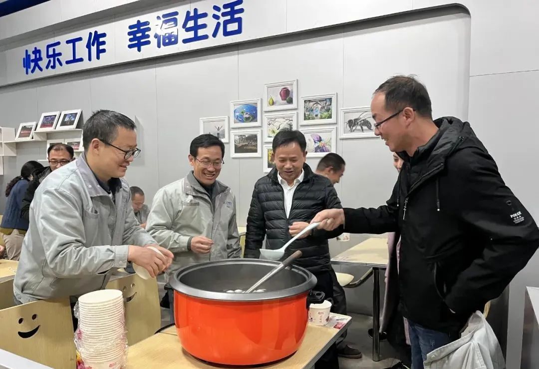 “吃汤圆啰!师傅们!”工会主席温小碧沿着通道,招呼忙碌的兄弟姐妹。只见战高温时期立下汗马功劳的大锅又派上了用场,乒乓球大小的汤圆与沸水相交融,跳起来好看的圆圈舞。大家洗过手后都陆续围了过来。“我要吃8个”,“我要吃2碗”,“我只吃2个”,大家纷纷报出需求,“不急不急,都有都有”,唐助才总经理一边舀着汤圆,一边说。“不够再加哈!”温小碧一边给大家递着碗一边说。“这个汤圆还可以,芝麻馅的”、“我喜欢的红糖馅,暖心”。员工们一边吃着,一边露出幸福的微笑。