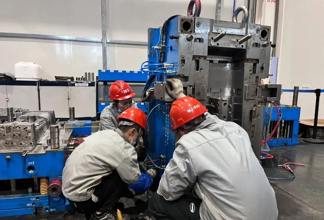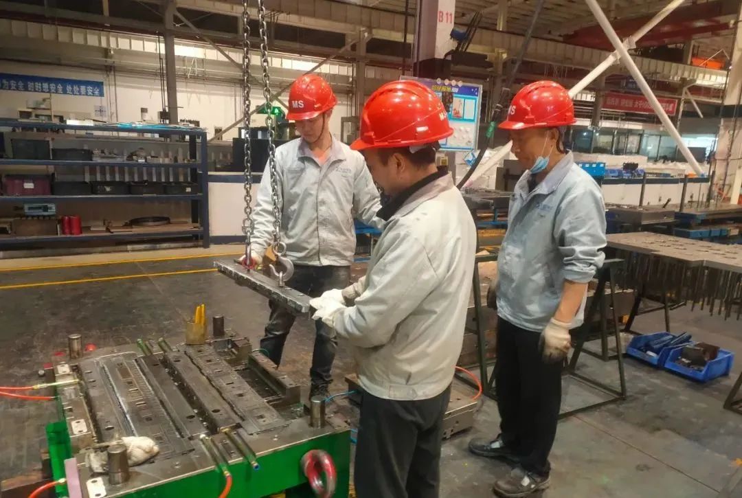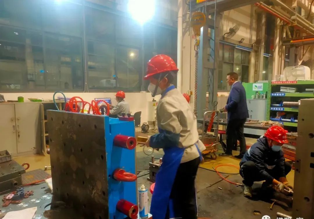 这边,装配组的技师们还在一块块的玩着“俄罗斯方块”,Q7A、mini86、85JS等模具着急交付试模,他们已经连续加班加点、挑灯夜战了好几个晚上。仔细一看,好多熟悉面孔,还有一群“小鲜肉”跟着忙前忙后。开新车、吊模具、修配镶件装配、碰模、试水、试顶......忙碌的身影在灯影下穿梭,略显疲惫,但很坚毅。这些都是技术活+体力活,需要全身心投入,才能安全保质保量的交付。
