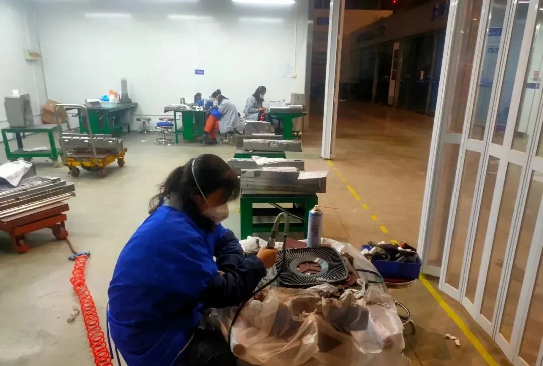 转身过来就是抛光班娘子军的主战场,她们正用巧手和自制的工具进行着精细化作业——给冰冷的钢铁“化妆”赋予美的灵魂,班长王春容带着10位女将再次投入战疫保产战斗中。由于此次闭环生产,抛光班的铁娘子们宿舍都安排在公寓,好几个新品项目排队赶进度,还有紧急模具插队,她们几乎每天都忙到九、十点,才能收拾工具回宿舍休息。