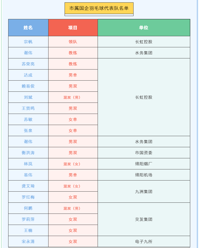 市属国企羽毛球代表队,是绵阳市国资委组织的、代表党的关系在市国资委党委的央属/省属/外地属和市属重要国有企业的参赛代表队,代表队的具体承办由长虹控股集团工会负责。按照市七运会竞赛规则和市国资委参赛要求,长虹工会在市属国企中选拔了来自长虹控股、交发集团、九洲集团等单位的18名职工组队,从六月上旬开始了正规集训直至开赛。