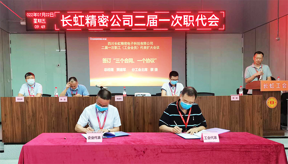 其次,工会主席蔡捷作了《2021年精密公司工会工作报告》,并代表精密公司全体职工,与精密公司企业代表贾建军总经理签订了《2022年四川长虹精密电子科技有限公司集体合同》、《2022年四川长虹精密电子科技有限公司工资集体协商协议》、《四川长虹精密电子科技有限公司劳动安全卫生专项集体合同》、《2022年精密公司女职工权益保护专项集体合同》。