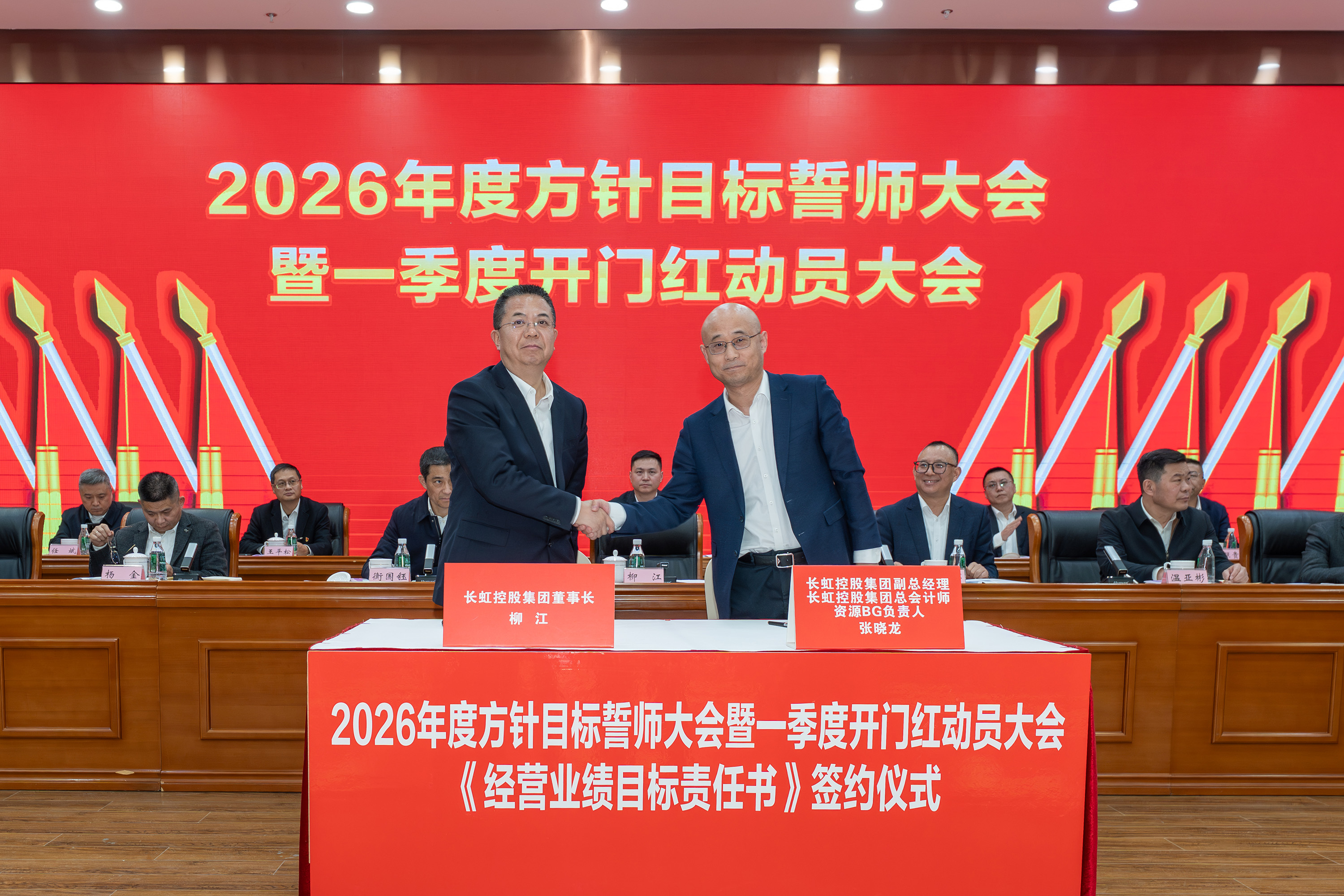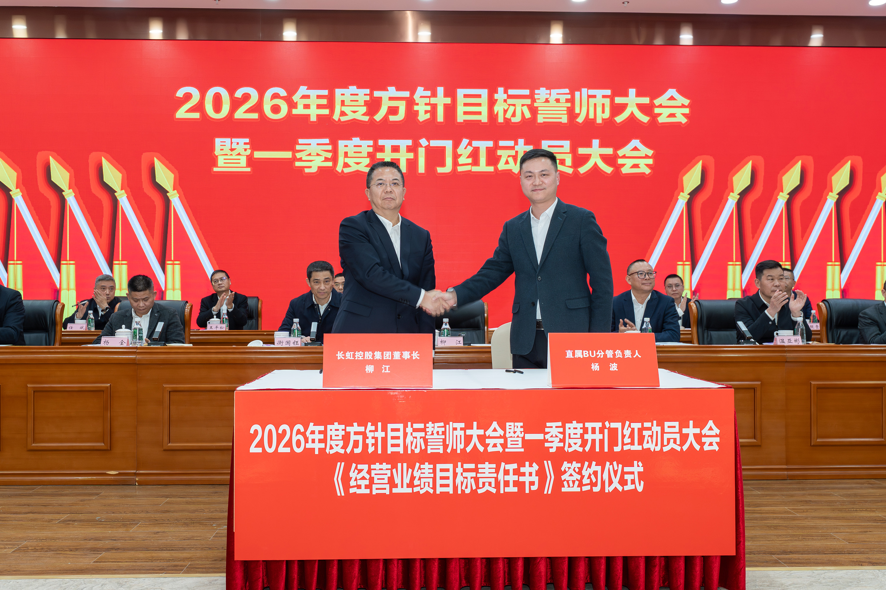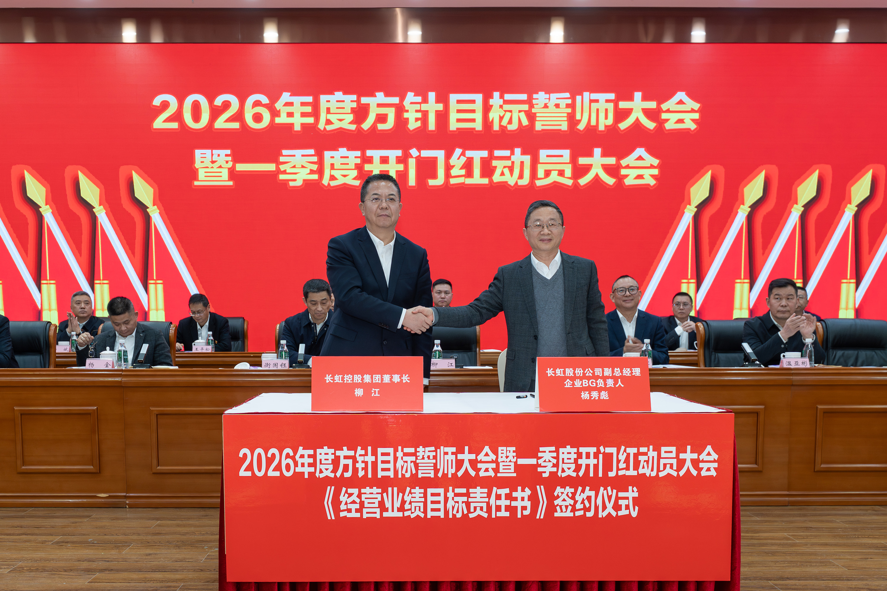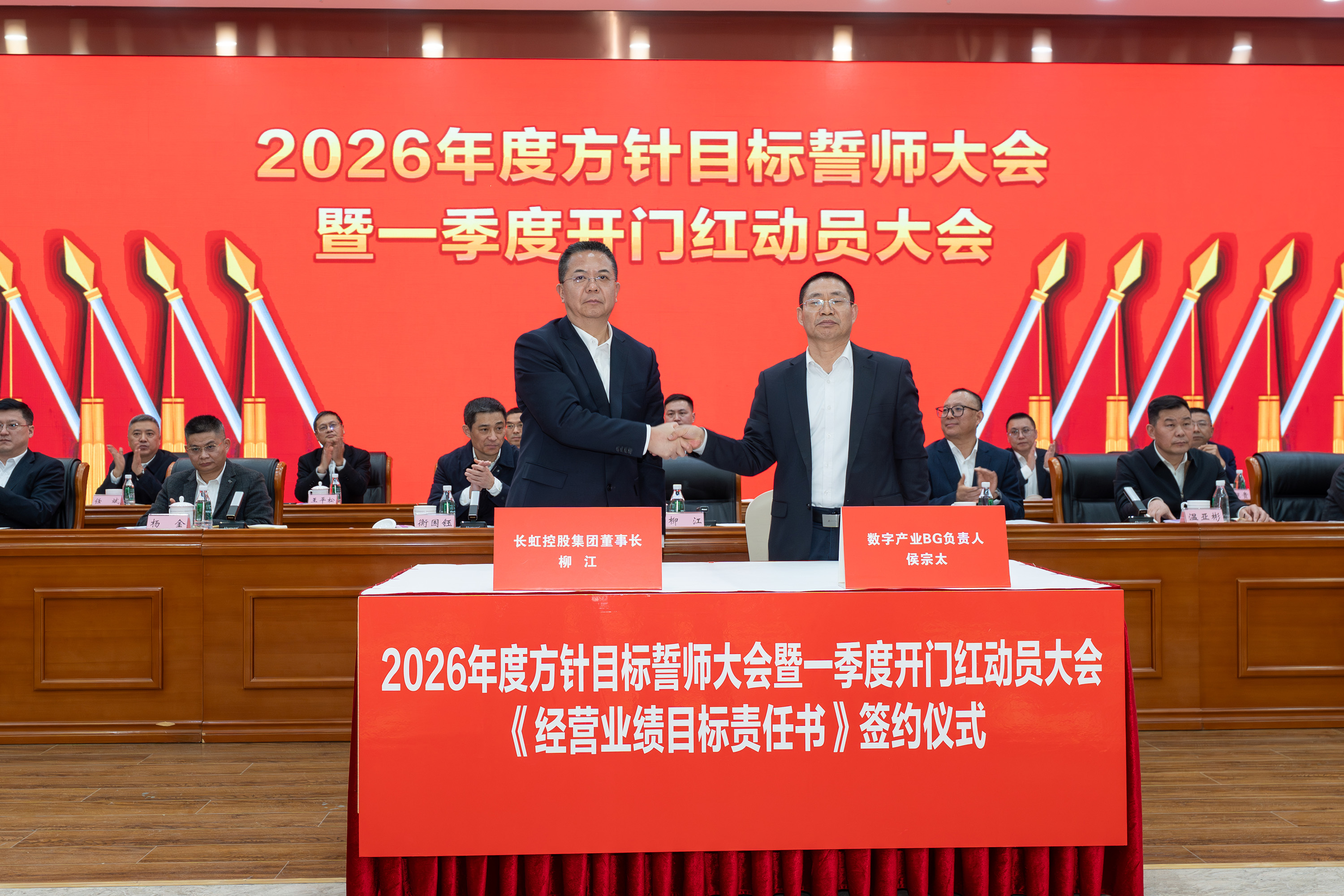2月5日,长虹控股集团2026年度方针目标誓师大会暨一季度开门红动员大会、2025年度技术创新大会、长虹控股集团二届五次/股份公司五届五次职工代表大会在长虹技术中心三楼会议室举行。集团党委书记、董事长柳江出席会议并讲话。 大会现场 会议指出,2025年是“十四五”规划收官之年,在全球局势复杂多变、行业竞争持续加剧的外部环境下,全体长虹人秉持着“艰苦奋斗、敢为人先、锲而不舍、精益求精”的精神,以昂扬的斗志、务实的作风,统筹推进产业布局、技术创新、智改数转、企业治理等重点工作,迎难而上、稳中有进,在经营规模、产业布局、科技创新等关键领域实现质效双升,交出了一份彰显责任与担当的高质量发展答卷。这份成绩的背后,是6万名长虹人凝心聚力、拼搏奉献的生动实践。 集团党委书记、董事长柳江在会上作重要讲话 会议强调,2026年既是“十五五”开局之年,也是长虹加快建设世界一流企业的夯基之年,当下,发展环境虽然更加困难、发展任务更加艰巨,但我们仍要看到市场中蕴藏着的巨大机遇。要抓住新一轮科技革命和产业变革加速突破的机遇,寻找新增长点,以人工智能等战略性新兴赛道推动产业升级,提升巩固行业地位。另一方面,要准确识变、科学应变、主动求变,全力拓展海外新市场、寻找海外新增量。同时,抢抓人工智能发展机遇,以AI生产力提升运营质效,锻造核心竞争力。集团上下要坚持“正风气、强担当、固根基、堵漏洞、补短板、扬优势”工作举措,朝着“加快建设世界一流企业”的目标开好头、起好步。要锚定“产品卓越”目标,培育强健的产业体系,打造用户满意的产品,增强盈利能力,持续厚植世界一流企业的产业根基;要锚定“品牌卓著”目标,不遗余力加强品牌传播,科学高效开展市场营销,尽力竭力搞好售后服务,持续彰显世界一流企业的价值优势;要锚定“创新领先”的目标,提升创新氛围,提升创新能力,提升创新时效,持续汇聚建设世界一流企业的强劲动能;要锚定“治理现代”的目标,以高质量党建引领高质量发展,提升科学化管理水平,锻造堪当重任的高素质专业化干部队伍,持续筑牢建设世界一流企业的坚强保障。 集团党委副书记、总经理杨军作2025年度公司经营工作报告,并安排部署2026年度重点经营工作 会议强调,2026年是“十五五”开局关键年,面对国际国内的形势变化和诸多的不确定性,全体长虹人要“向新而行、决胜AI时代”。秉持“稳进提质增效,协同创新赋能,品牌智造卓越”经营方针,于变局中开新局,在奋进中创辉煌。要加强战略牵引,聚焦“3+1+N”产业布局,构建有竞争力的产业体系。要强化科技引领,把创新刻进DNA里。要深化国企改革,推动企业高质量发展。要筑牢底线基础,抓好合规体系建设,盯住重点风险领域,在不确定性中守住确定性。要坚持党建引领,将独特的“虹色”基因充分转化为公司发展的动能。 会议号召,全体员工要以奋进之姿勇担使命,聚焦主责主业、狠抓能力建设,全力实现一季度“开门红”,同心笃行、聚力创新,奋力实现“十五五”良好开局。 集团党委副书记、工会主席衡国钰主持会议 会上,柳江分别与杨军,消费者BG,企业BG,JGBG,资源BG,能源环保BG,数字产业BG,直属BU等,签订了经营业绩目标责任书。 签订经营业绩目标责任书 在过去的一年,面对复杂严峻的外部环境与艰巨繁重的改革发展任务,全体长虹干部员工凝心聚力,迎难而上,推动公司经营在高质量发展的轨道上稳健前行,整体发展质效稳步提升。在此过程中,涌现出了一批勇于担当、业绩突出的经营卓越和优秀团队,展现出强大的战略执行力和攻坚克难的精神。 经营卓越单位 长虹佳华:持续推进外部新业务突破和内部精细化管理,海外和增值业务保持较大增速,低空经济和数字营销等新兴领域布局初见成果,驱动经济规模再上新台阶。 长虹华丰科技:持续深化产业布局与资源配置,紧抓行业机遇,高速通讯连接器等核心赛道的战略投入成效凸显,驱动经营业绩实现高速增长。 2025年度经营卓越单位长虹佳华控股集团副总裁何建华发言 2025年度经营卓越单位长虹华丰科技负责人刘太国发言 经营优秀单位 长虹能源:坚持稳健经营,有效应对贸易环境变化,持续推进内部精细化管理,产能稳步提升,高倍率锂电池与聚合物电池业务高速增长,整体实现稳步健康发展。 长虹国际冰洗:坚持“一企双区”品牌发力、品类协同项目凸显、关键客户拓展有力、洗衣机业务快速突破,整体业绩大幅增长。 广东长虹:克服关税地缘冲突影响,抢抓客户订单,优化产品结构,实现收入、利润双增,再创历史新高。 会上,长虹能源、长虹国际冰洗、广东长虹单位等负责人分别以“锚定目标不放松,使命必达”为主题作了先进经营管理经验分享。 2025年度经营优秀单位长虹能源负责人郭龙发言 2025年度经营优秀单位长虹国际冰洗负责人阳周发言 2025年度经营优秀单位长虹国际智显(广东长虹)副总经理蒋吉强发言 2025年,长虹人坚持创新,将技术突破融入发展基因,将创新活力转化为推动产业升级的澎湃动能,一系列技术成果为提升长虹市场竞争力奠定了坚实基础。一批技术创新成果、技术创新人物、智造先进个人、智造优秀案例、智能制造先进单位获得表彰。 技术创新成果、技术创新人物、智造先进个人、智造优秀案例、智能制造先进