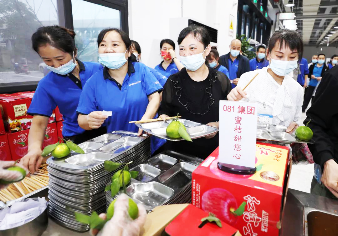 10月2日晚 位于智能制造产业园的长虹职工 正在食堂吃着公司精心准备的晚餐。 和前两天不同的是 今天的晚餐 每人都多了一个新鲜的桔子 吃着甜甜的桔子 忙碌过后的疲惫感一扫而空 职工们都露出了笑脸。 那么,晚餐中的桔子从何而来呢 原来,这些蜜桔都来源于位于广元市的兄弟单位长虹零八一集团 绵阳市本轮疫情自发生以来,时刻牵动着泛虹兄弟单位的心。10月2日,针对长虹在绵企业闭环生产实际情况,长虹零八一集团以最快的速度、最大的能力,积极动员,快速集结,第一时间筹集柚子、苹果、桔子、梨子等近8000斤生活物资送往了长虹智能制造产业园。同时,零八一集团相关部门还从物资的质量、安全、包装等方面,进行严格把关,在物资运输、调拨、装卸等层面将各项疫情防控措施落实落细,确保物资安全。 蜜桔甜人心!此次向在绵兄弟单位运送的爱心物资,体现了“同源共流”的深厚情谊和并肩抗疫的坚定决心,也寄托着长虹零八一集团对奋战抗疫一线闭环生产企业的美好祝愿,进一步彰显了零八一集团作为军工BG单位的责任担当。 除了零八一集团支援的蜜桔外 相信每一个闭环生产奋战的职工 在吃饭休息时还喝到了一杯酸奶 原来,10月1日,控股集团领导在实地慰问保产职工后提出:给每位保产职工每天送一杯酸奶。 接到控股集团领导指示后,佳虹公司立即多方联系供应商,终于从成都紧急调货,确保了从10月2日起开始为职工供应酸奶。 因为疫情,闭环生产的条件比较艰苦 但长虹关爱职工的心意从不打折 一定会竭尽所能 给大家提供充足的后勤保障 保证大家住得舒心、吃得放心 工作更顺心