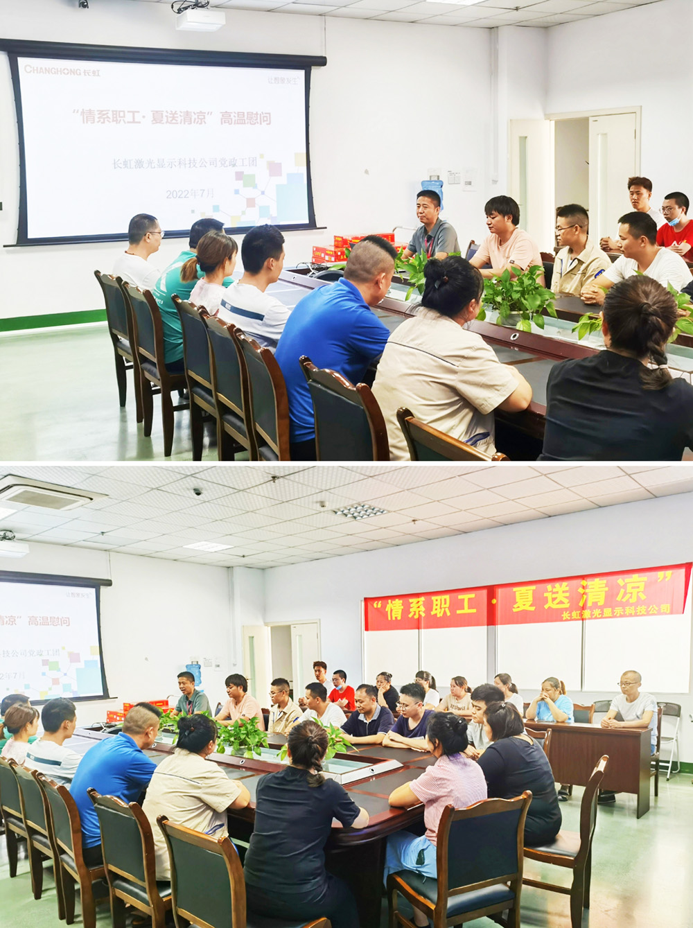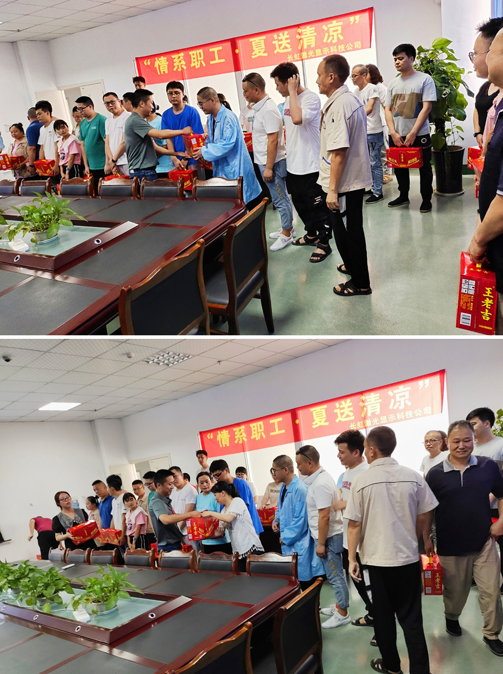 为做好夏季防暑降温工作,切实保障一线员工的身体健康,确保夏季高温期间各项工作的安全运行。2022年7月12日下午3点,激光显示科技公司慰问高温下坚守岗位的劳动者,感谢大家的辛勤付出,并一一送上高温慰问品。 公司副总经李先平非常重视高温期间的安全生产工作,要求大家要严格落实各项安全生产防护措施,合理安排好休息时间,认真备战高温酷暑天气,并对不畏高温、兢兢业业、默默付出的一线员工送上了亲切的关怀和问候。 一份清凉、一份关怀、一份爱心,让大家备受感动和鼓舞。高温虽然还在延续,但激光公司全体员工将一如既往坚守岗位,一丝不苟做好本职工作,全力保障各项工作的顺利开展!