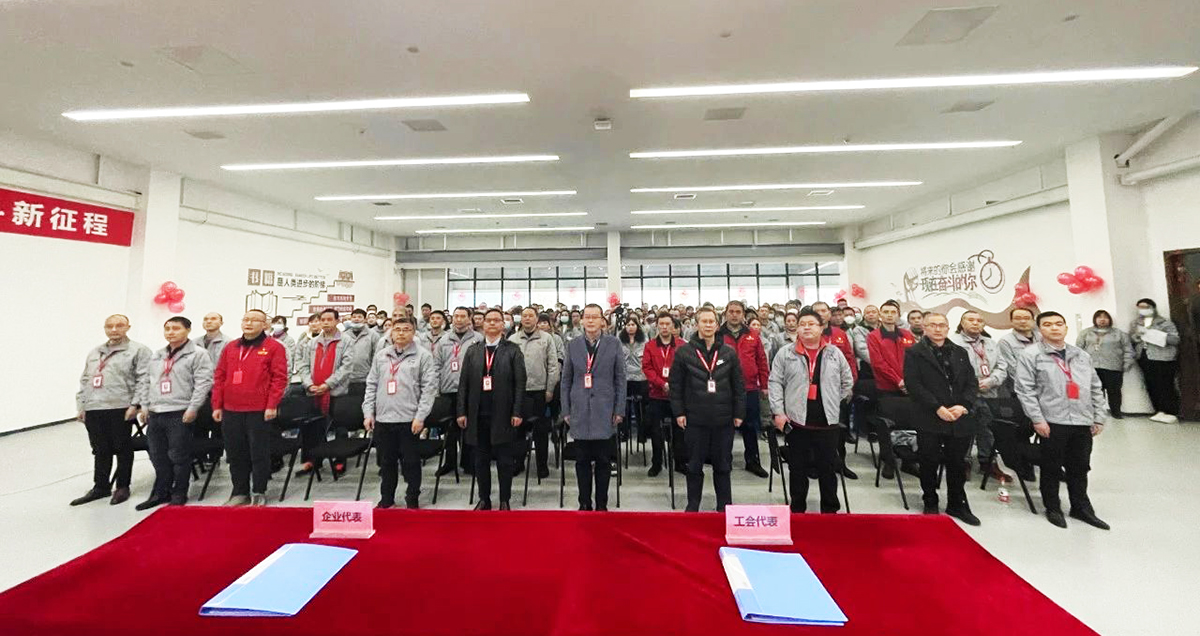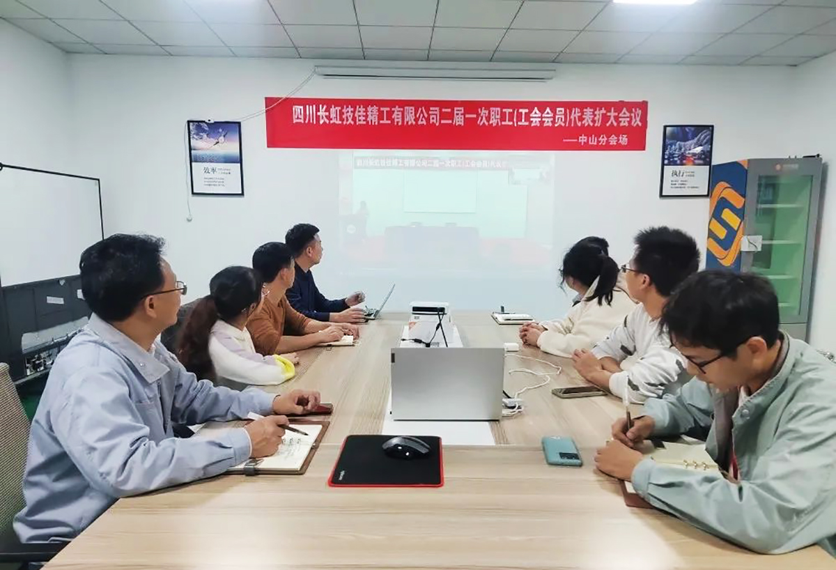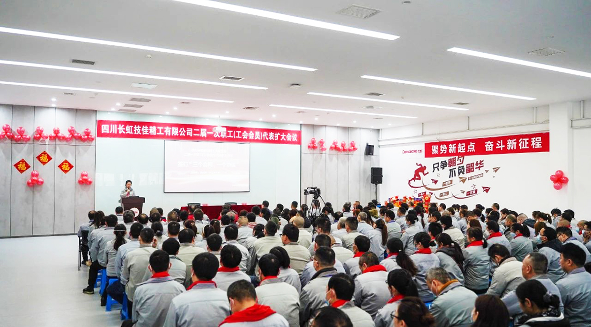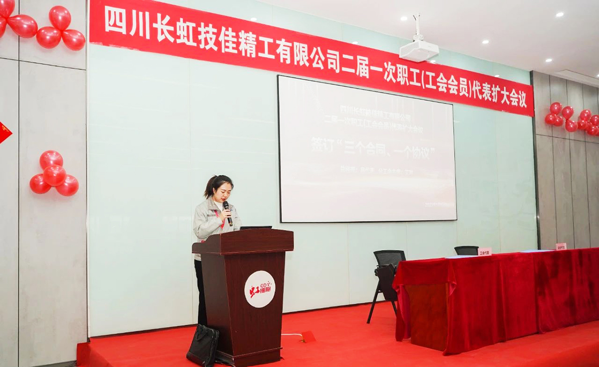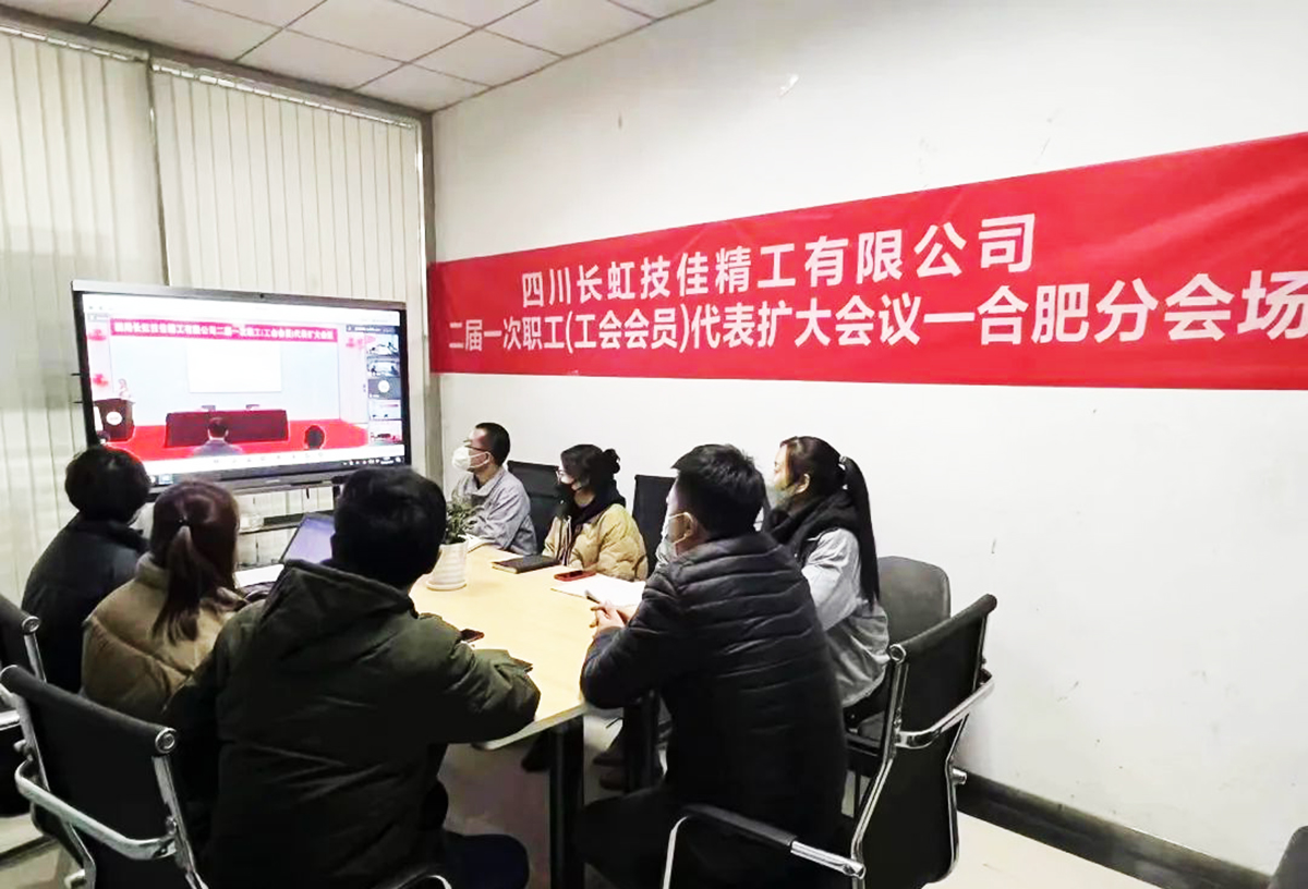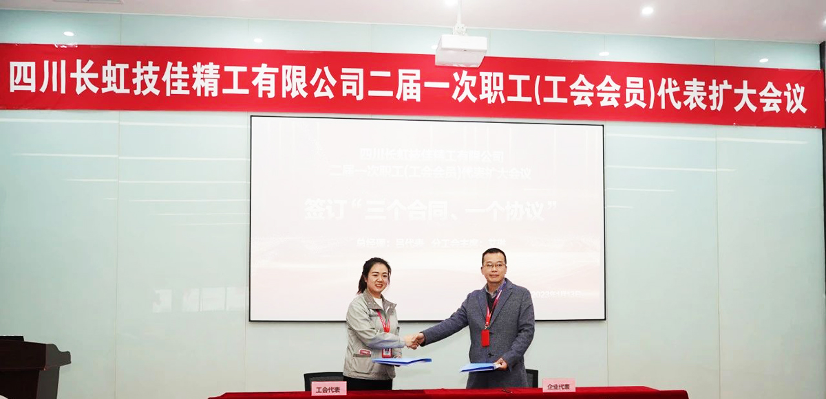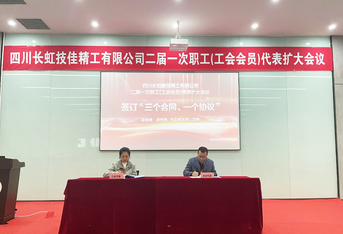 1月13日,四川长虹技佳精工有限公司二届一次职工代表大会胜利召开。长虹技佳公司党总支书记/总经理吕代表同志、长虹技佳公司副总经理戴德军同志、长虹技佳公司财务总监罗博同志、长虹技佳公司市场营销总监张春明同志、长虹技佳公司分工会主席艾琳同志出席了本次会议。本次大会由在绵主会场+三个异地分、子公司分会场组成,主会场设置在技佳河边镇G02二楼职工培训室,分会场同步连线参与大会。长虹技佳工会主席艾琳同志担任主持,长虹技佳公司党总支纪检专员、各产线(部门)负责人以及职工代表、特邀代表参加会议。 一 异地分、子公司会场 伴随激情的《长虹之歌》,大会拉开帷幕。长虹技佳工会主席艾琳同志分别向与会代表作了《2022年度“三个合同,一个协议”执行情况报告》和《2022年度长虹技佳分工会工作报告》。系统回顾了过去一年中工会工作和“三个合同,一个协议”执行情况以及分工会年度工作情况。 随后,由吕代表同志作为公司代表,艾琳同志作为职工方代表,双方签订了《2023年四川长虹技佳精工有限公司工资集体协商协议》、《四川长虹技佳精工有限公司劳动安全卫生专项集体合同》、《四川长虹技佳精工有限公司女职工权益保护专项集体合同》、《四川长虹技佳精工有限公司职代会集体合同》 各项协议合同签订完毕后,长虹技佳公司总经理吕代表同志向大会作2022 年公司生产经营报告及 2023 年度生产经营情况简介。 最后,四川长虹技佳精工有限公司二届一次职工代表大会伴随着铿锵有力的大合唱《咱们工人有力量》圆满闭幕。
