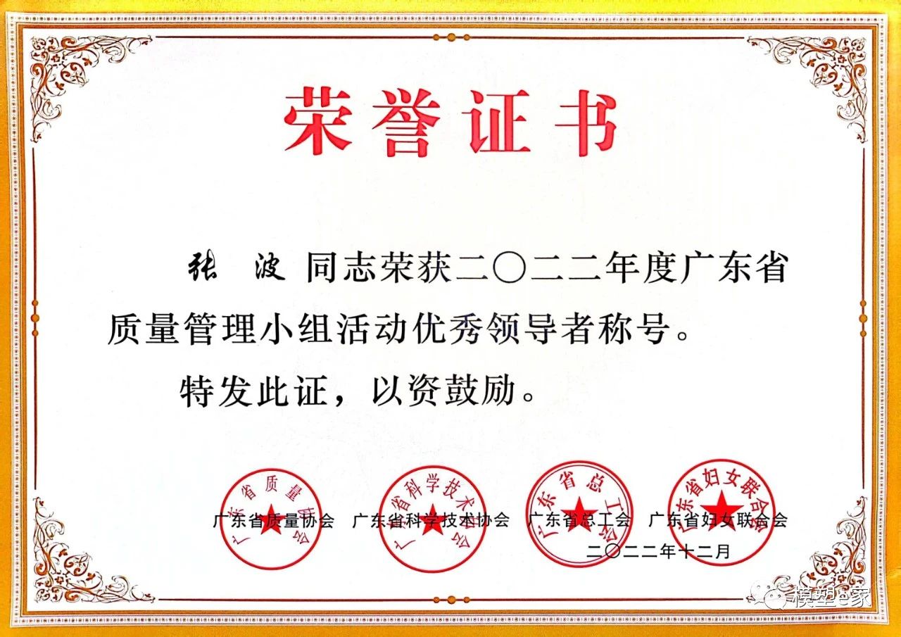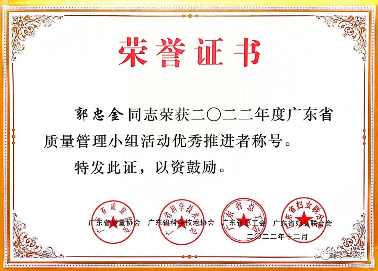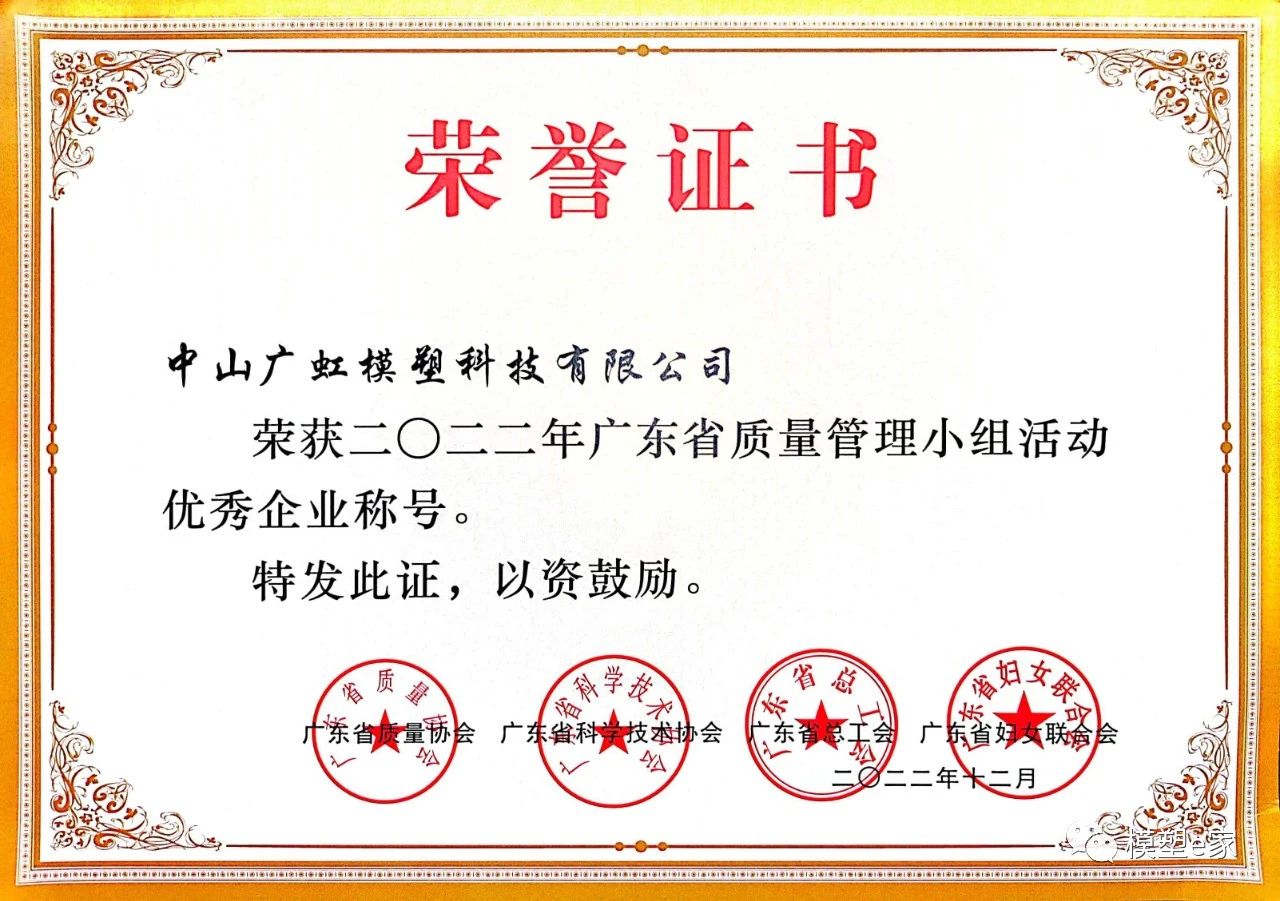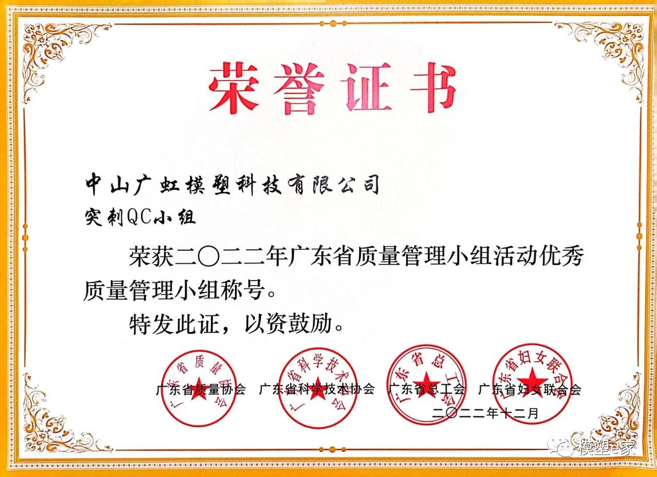 喜 获 殊 荣 近期中山广虹模塑科技有限公司收到广东省质量协会颁发的2022年QC活动相关的荣誉证书。 公司荣获2022年广东省质量管理小组活动优秀企业称号。 突刺QC小组荣获2022年广东省质量管理小组活动优秀质量管理小组称号; 张波总经理荣获2022年广东省质量管理小组活动优秀领导者称号; 郭忠金总监荣获2022年广东省质量管理小组活动优秀推进者称号。 这些荣誉的取得,离不开长虹模塑及广虹模塑领导的指导和关心,也离不开广虹模塑全体人员的支持和配合。荣誉即是激励,更是鞭策。2023年,广虹模塑将继续在长虹模塑的指导下,围绕“提高产品质量、提升工作效率”等群策群力开展“小、实、活、新”的QC课题,注重QC课题活动的过程以及对问题分析和解决的效果,全力为公司降本增效贡献力量。