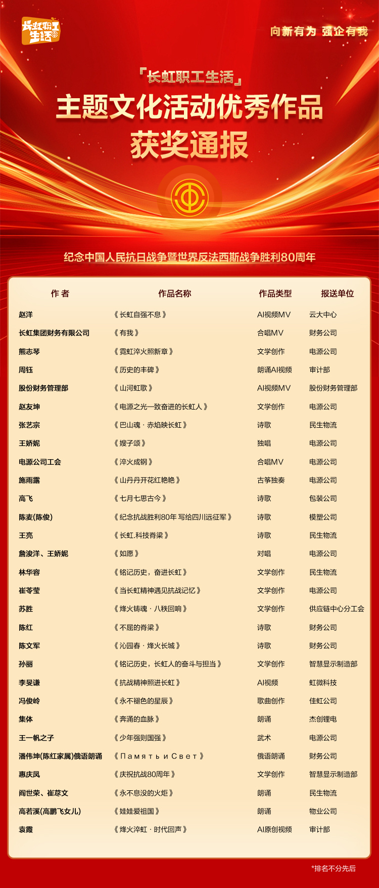 科技长虹 产业报国 在纪念中国人民抗日战争暨世界反法西斯战争胜利80周年的伟大时刻,为大力弘扬不屈不挠、奋勇向前的伟大抗战精神,生动展现新时代长虹职工“科技长虹 产业报国”的坚定信念与昂扬风貌,长虹控股集团工会举办了主题文化作品征集活动。 自活动启动以来,得到了各单位的高度重视和广大职工及家属的积极响应与热情参与。众多集体、职工个人及职工家属踊跃提交了形式多样、内涵丰富的文艺作品。这些作品涵盖了合唱、独唱、朗诵、诗歌、散文、器乐演奏、舞蹈、AI创作短视频、AI绘画、摄影以及词曲原创等多种艺术形式,充分展现了长虹人深厚的文化底蕴、饱满的创作热情和积极向上的精神境界。 经评委组对全部参赛作品进行认真细致的审阅与评选,最终评选出29件优秀作品。 现将获奖名单公布如下(排名不分先后): 特对以上获奖单位、职工及家属表示热烈的祝贺! 此次主题文化活动,不仅是一次艺术的呈现,更是一次深刻的精神洗礼。它再次证明,长虹人不仅是科技创新的排头兵,也是企业文化的建设者和传承者。希望全体长虹职工能以此次活动为契机,继续将伟大的抗战精神内化于心、外化于行,将活动中激发出的爱国热情、集体荣誉感和创作活力,转化为立足岗位、建功立业的强大动力,共同为“科技长虹 产业报国”的宏伟蓝图添砖加瓦,在新时代的征程上续写新的辉煌!